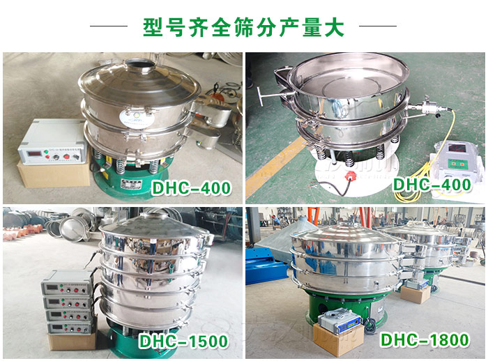 超聲波旋振篩型號齊全產(chǎn)量大,型號有DHC-400、DHC-600、DHC-800、DHC-1000、DHC-1200、DHC-1500、DHC-1800、DHC-2000等,材質(zhì)可選擇不銹鋼、碳鋼材質(zhì)。還可根據(jù)不同需求特殊定制(加高加緣、安裝進料斗等)。相同型號產(chǎn)量比普通旋振篩產(chǎn)高10-15倍。