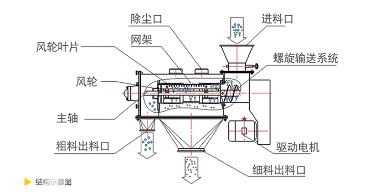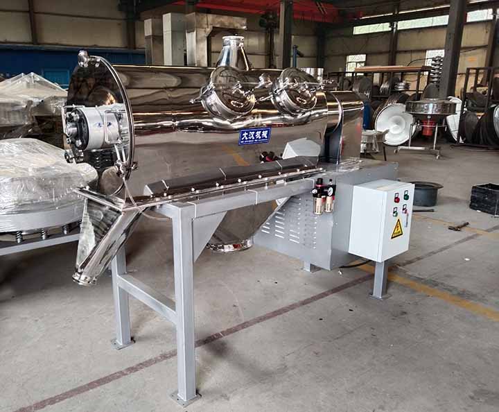離心式篩分機從外觀上看上部為水平放置的圓柱形、下部為圓錐形的密閉容器,篩機下面有支腿以支撐整個篩機。電機通常位于設(shè)備頂部或底部,通過皮帶或直接驅(qū)動主軸。進(jìn)料口通常在筒的一端或頂部,物料通過管道或漏斗送入。出料口有兩處,一處是細(xì)顆粒出口,一處是大顆粒出口,一般在筒的另一端或筒側(cè)面。