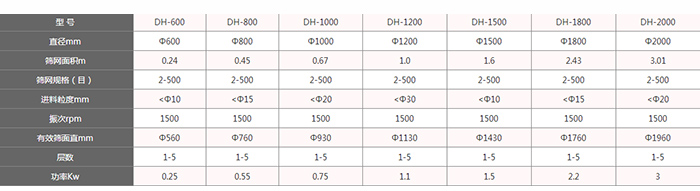 不銹鋼旋振篩分機型號有:DH-400mm、DH-600mm、DH-800mm、DH-1000mm、DH-1200mm、DH-1500mm、DH-1800mm、DH-2000mm等八種標(biāo)準(zhǔn)型號。(可以按照用戶的需求進行特殊型號定制)
