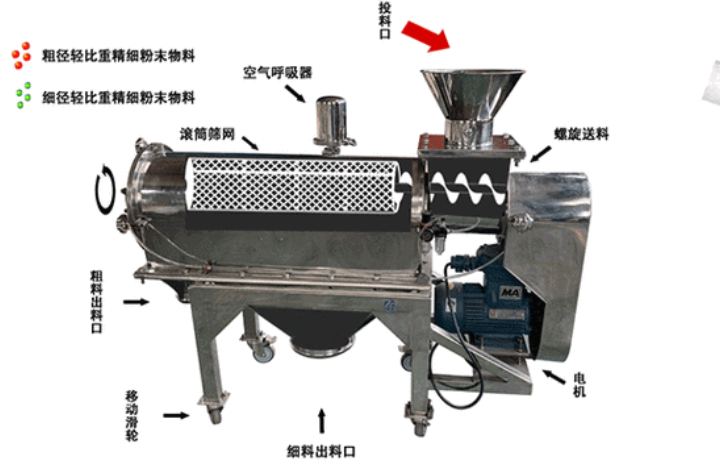 靈芝超微粉在 WQS30-100氣旋篩中如何進(jìn)行篩分作用?靈芝粉置于機(jī)體內(nèi),物料通過(guò)螺旋輸送系統(tǒng)后,和氣流混合、霧化進(jìn)入網(wǎng)筒內(nèi);通過(guò)網(wǎng)筒內(nèi)風(fēng)輪葉片使物料同時(shí)受離心力和旋風(fēng)推進(jìn)力,從而近使物料噴射過(guò)網(wǎng),由細(xì)料排出口排出,不能過(guò)網(wǎng)的物料沿網(wǎng)筒壁從粗料排出口排出。