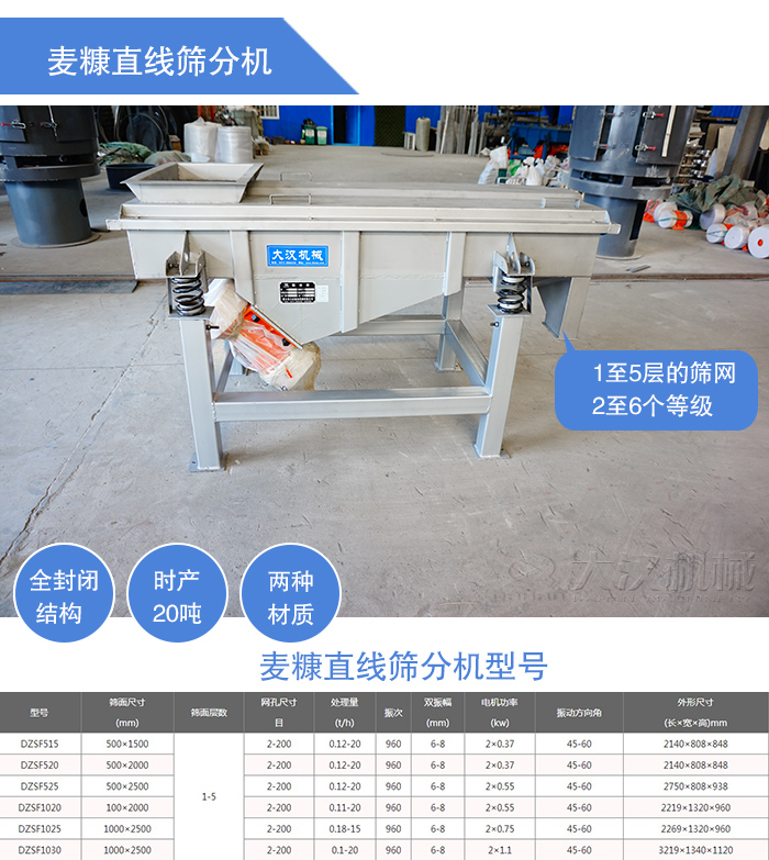 麥糠直線(xiàn)篩分機(jī)主要用于大產(chǎn)量篩分工作中,每小時(shí)篩分產(chǎn)量可達(dá)20噸,不同的型號(hào)滿(mǎn)足不同產(chǎn)量的篩分要求,1至5層的篩網(wǎng)安裝能同時(shí)將麥糠進(jìn)行2至6個(gè)等級(jí)的篩選、分級(jí),雜質(zhì)、粗料自動(dòng)化排出,全封閉結(jié)構(gòu),無(wú)粉塵溢散,材質(zhì)有碳鋼(Q235)不銹鋼(304、316),是一臺(tái)大產(chǎn)量篩分設(shè)備。